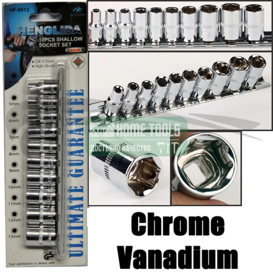 Комплекта съдържа глухи ключета, вложки: 4, 5, 6, 7, 8, 9, 10, 11, 12, 13 mm