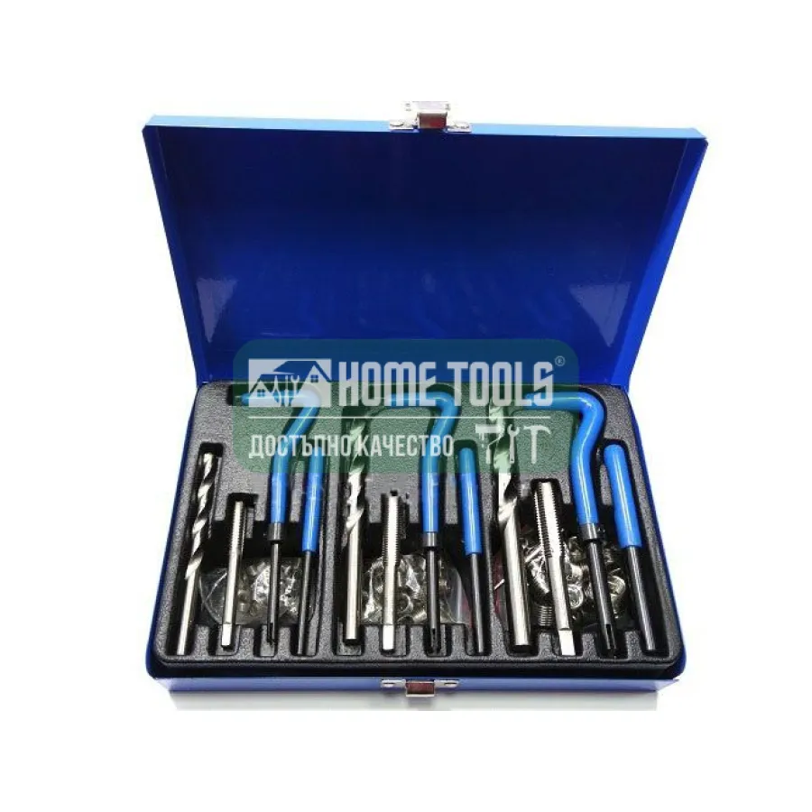 К-т за възстановяване на резби 88 части. Размери: 25 бр. M6x1.0x 10.8 мм, 25 бр. M8x1.25x 10.8 мм, 25 бр. M10x1.5x 13.5 мм. 3 бр. бургии, 3 бр. метчици, 3 бр. рамо за пружина.