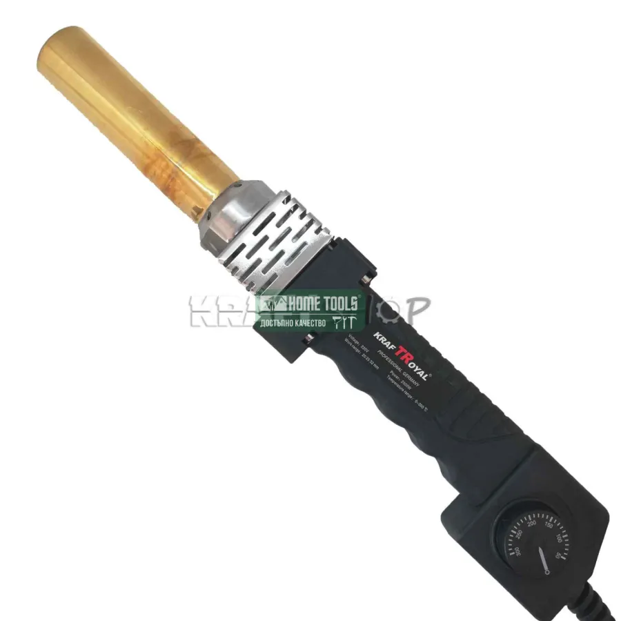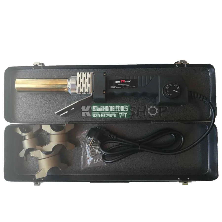 Заваръчен комплект за полипропилен KraftRoyal 2500W за запояване на полипропиленови тръби и фитинги. Моделът е с кръгъл нагревател. Заварява 0 - 300 градуса.Регулацията на температурата е електронна.