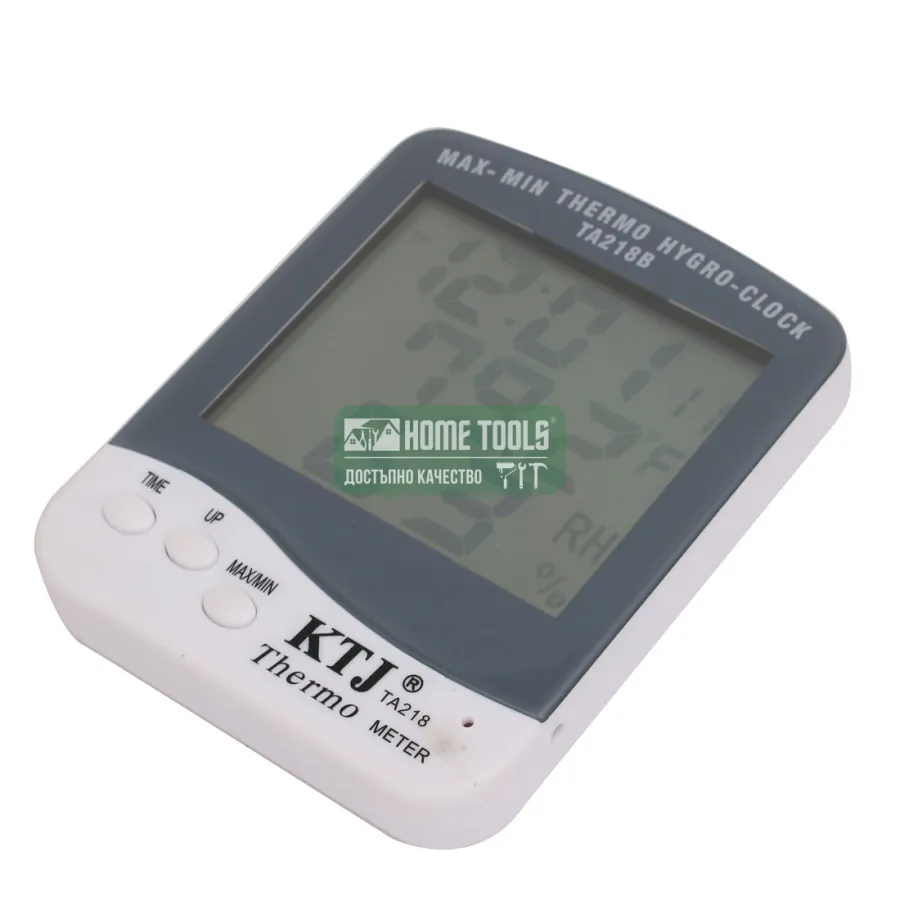 Уреда измерва вътрешна температура и влажност на въздуха, показва също час и дата.