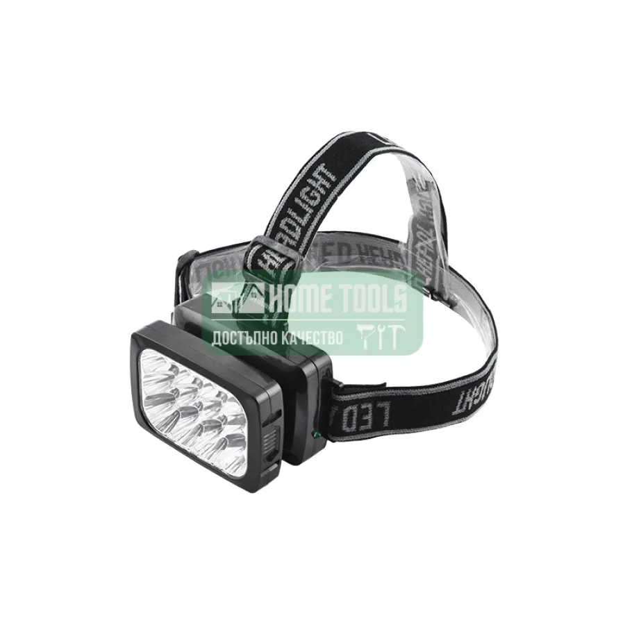 ЛЕД челникът е със зарядно за 220V и еластична лента за закрепване на главата.