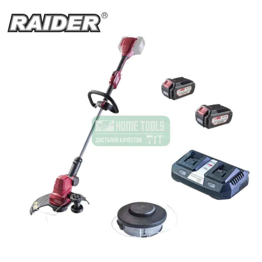 Акумулаторен тример Raider RDP-SCBC20, 2x 20V+ 2 бр. Акумулаторна батерия Raider + Двойно зарядно устройство Raider R20 + Корда с макара и капачка Raider