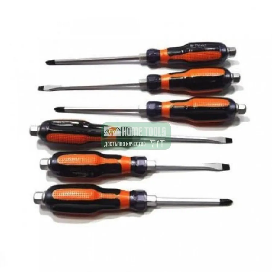 Сетът съдържа 5 отвертки с ергономични дръжки. Те са изработени от устойчив полипропилен, изключително подходящ материал за инструменти, които понасят усилена експлоатация. Облата форма на ръкохватките има вдлъбнатини, които прилягат на дланта. Предлагат няколко опорни точки при захващане и разпределят натоварването. Облеклото от TPR осигурява добро сцепление и предотвратява хлъзгането.