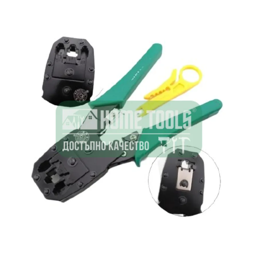 Клещи за кримпване RJ45 HT-315 в комплект с нож са универсални клещи за кримпване на лан кабели със следните конектори – RJ11, RJ12, RJ45. Ножът е чудесно допълнение за изчистване на кабелите от изолацията.