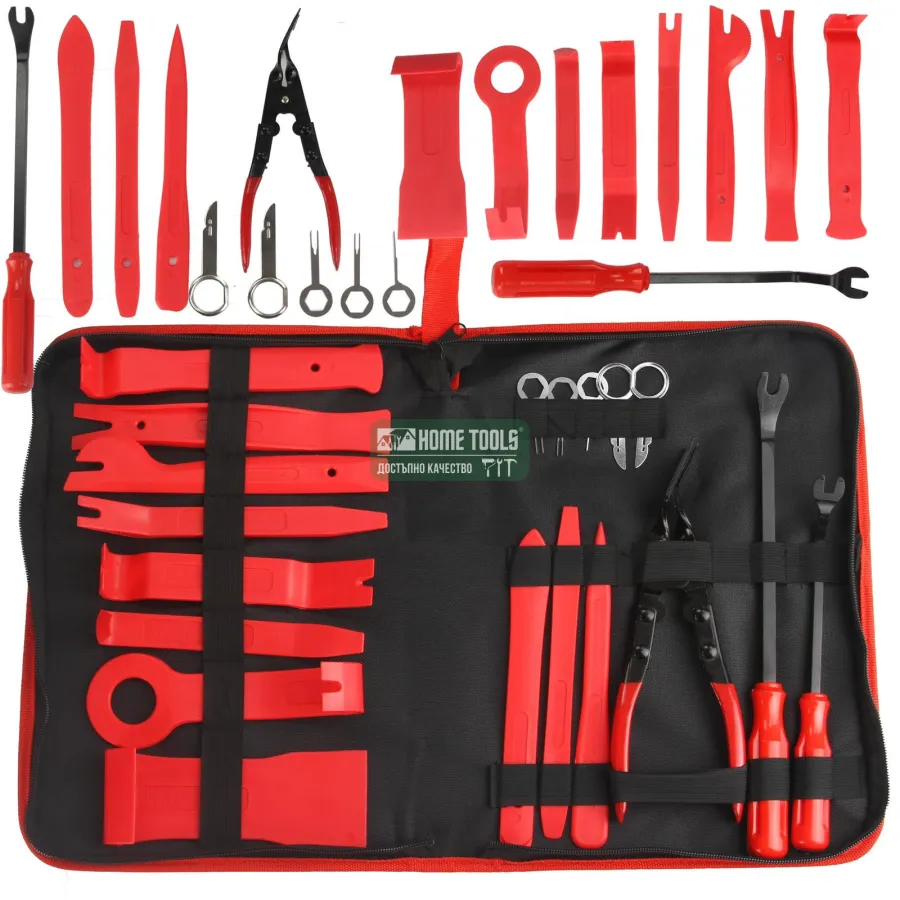 омплект от 19 инструмента за демонтаж без повреди на декоративни части, пластмасови щипки, капаци, стъкла за огледало за обратно виждане и др.