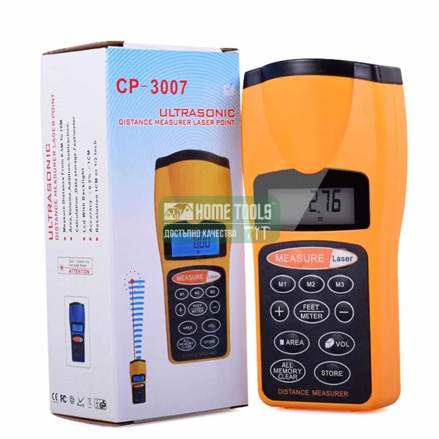 Ultrasonic CP-3007 е произведена от висококачествен полимер, устойчив на продължителна употреба. Измерва разстояния с висока точност и предлага измгерване в метрична система или имперската. Уредът позволява да събирате и изваждате две мерки, както и да запаметявате до 3 резултата. Разполага с опция за автоматично изключване, ако не натискате бутоните в продължение на 1 минута. Устройството има издръжлива батерия, а яркият й жълт цвят я прави лесно забележима сред останалите инструменти.