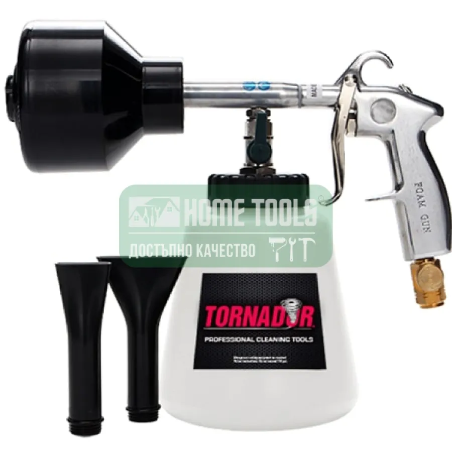 почиства кожа,пластмаса,двигател,джанти,арматурно табло,автотапицетии,въздуховоди,килими,мека мебел и много други неща.Благодарение на своя дизайн,работата е максимално улеснена.Пистолетът има голям резервоар за препарат,което ви осигурява дългосрочна работа без необходимостта от често презареждане на разервоара.Металното топче в резервоара позволява по-добро засмукване на препарата,когато се работи в различни позиции,в пулверизатор на торнадор се слага препарат за интериорно пране разреден според зависи от степента на замърсявасне.