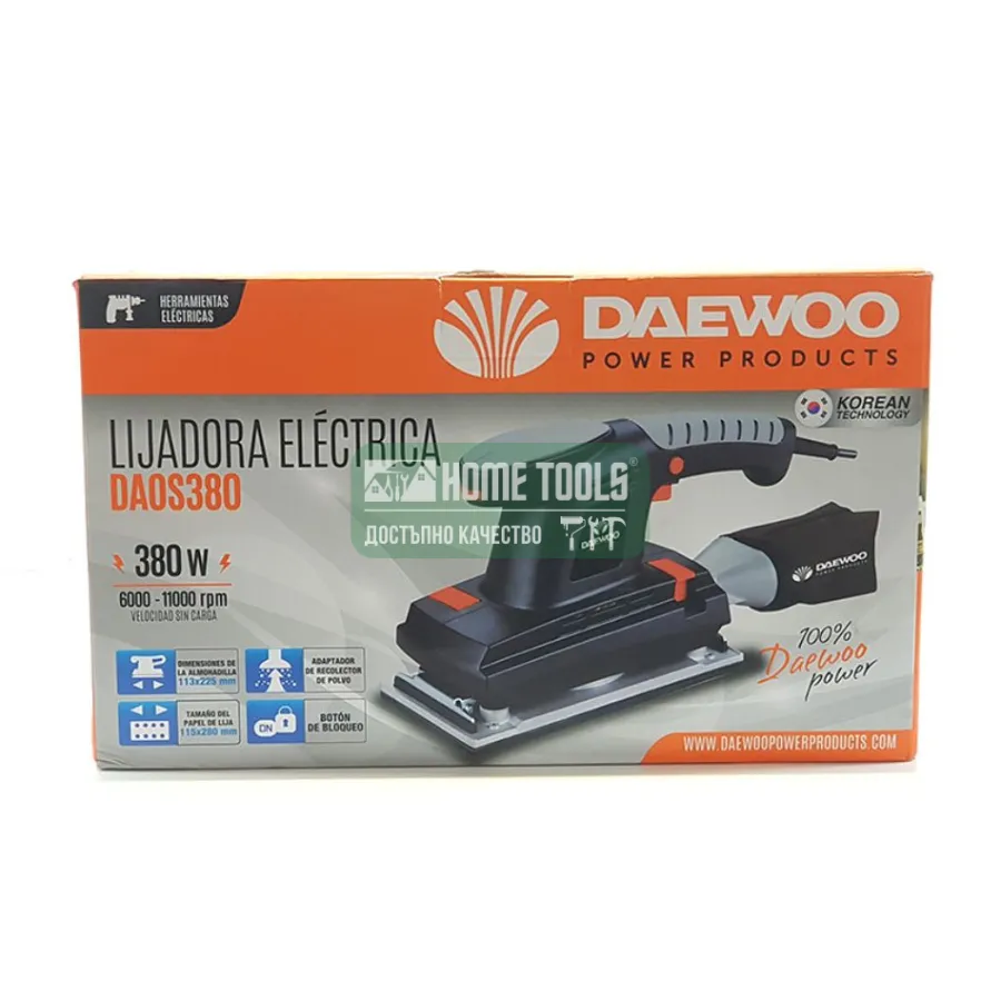 Виброшлайф DAEWOO DAOS380 е с мощност 380 W и обороти на празен ход 6000-11000 об./мин. Размерът на шлифовъчната плоча е 255х113 мм, а на шкурката - 280х115 мм. Доставя се с адаптер за прах от 1 кг и хартия за шлифоване 1 кг. Ергономичният и иновативен дизайн прави машината надеждна.