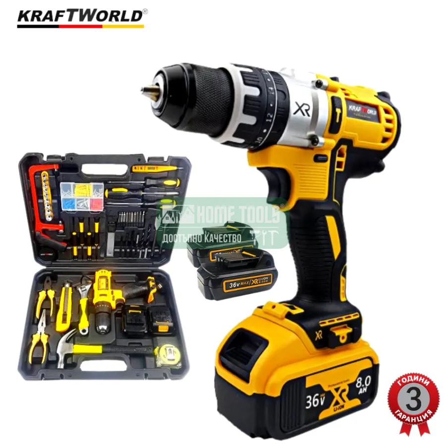 Акумулаторен Винтоверт KRAFTWORLD 36V + 111 части / Бормашина в комплект с инструменти