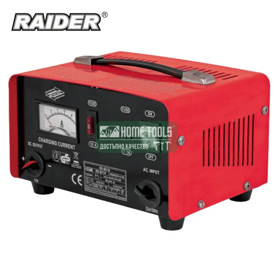 Зарядно за акумулатор RAIDER RD-BC10 е с мощност 85 W, подходящо е за акумулаторни батерии с капацитет от 20 Ah до 60 Ah. С амперметър отчитащ моментната сила на зарядния ток. Има защита срещу неправилно включване спрямо полярността на клемите.